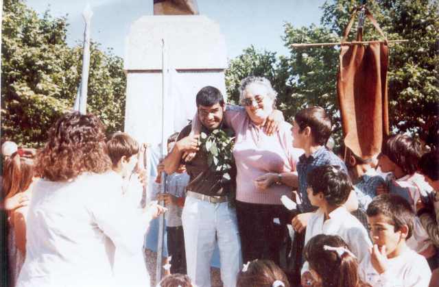 "MATUNO", abrazado con Anita Aguirre.
