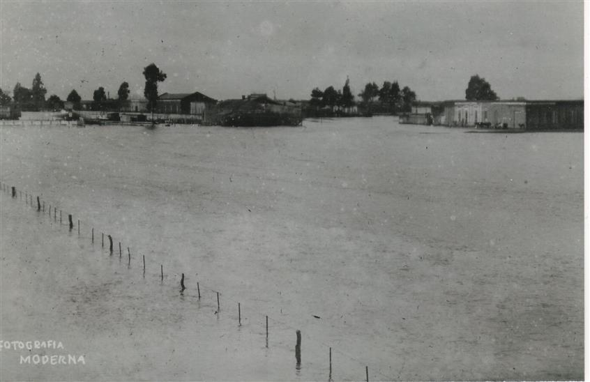 La foto que exhibo es sacada por una inundación antes del año 1920 (Paso a nivel Sud) y se constata la gran cantidad de agua que había llegado y al fondo se ve la propiedad que era de mi abuelo Domingo Chiste y que era conocida por el "boliche de la loma".- Se ve algunos vacunos en la vereda.-